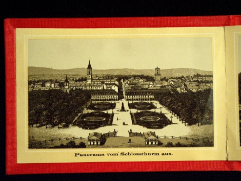 Karlsruhe. Leporello mit photolithographischen Ansichten von Karlsruhe. Roter Original-Leineneinband mit Goldprägung. Um 1890.