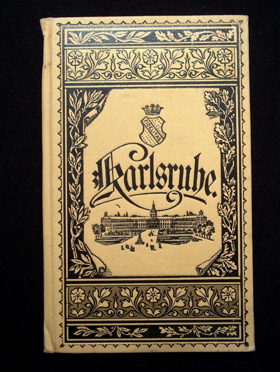 Leporello mit photolithographischen Ansichten von Karlsruhe. Sehr schön gestalteter beige-farbener Leineneinband mit schwarzer Prägung. Reichlich verziert. Um 1890.