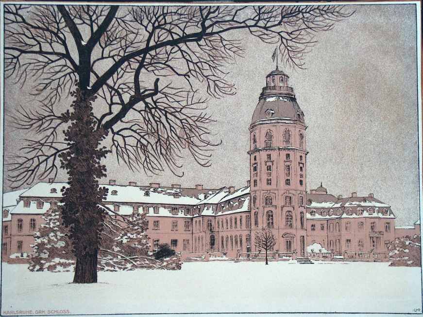 Gustav Kampmann: Karlsruhe, Grh. Schloss, Lithographie der Kunstdruckerei Künstlerbund Karlsruhe. Format ca. 39 x 29 cm.