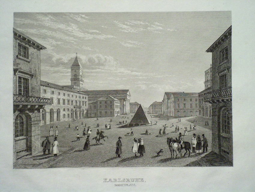 Karlsruhe, Marktplatz. Ansicht des Marktplatzes von Norden nach Süden.