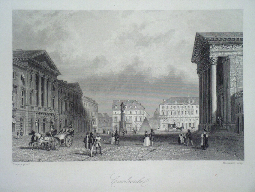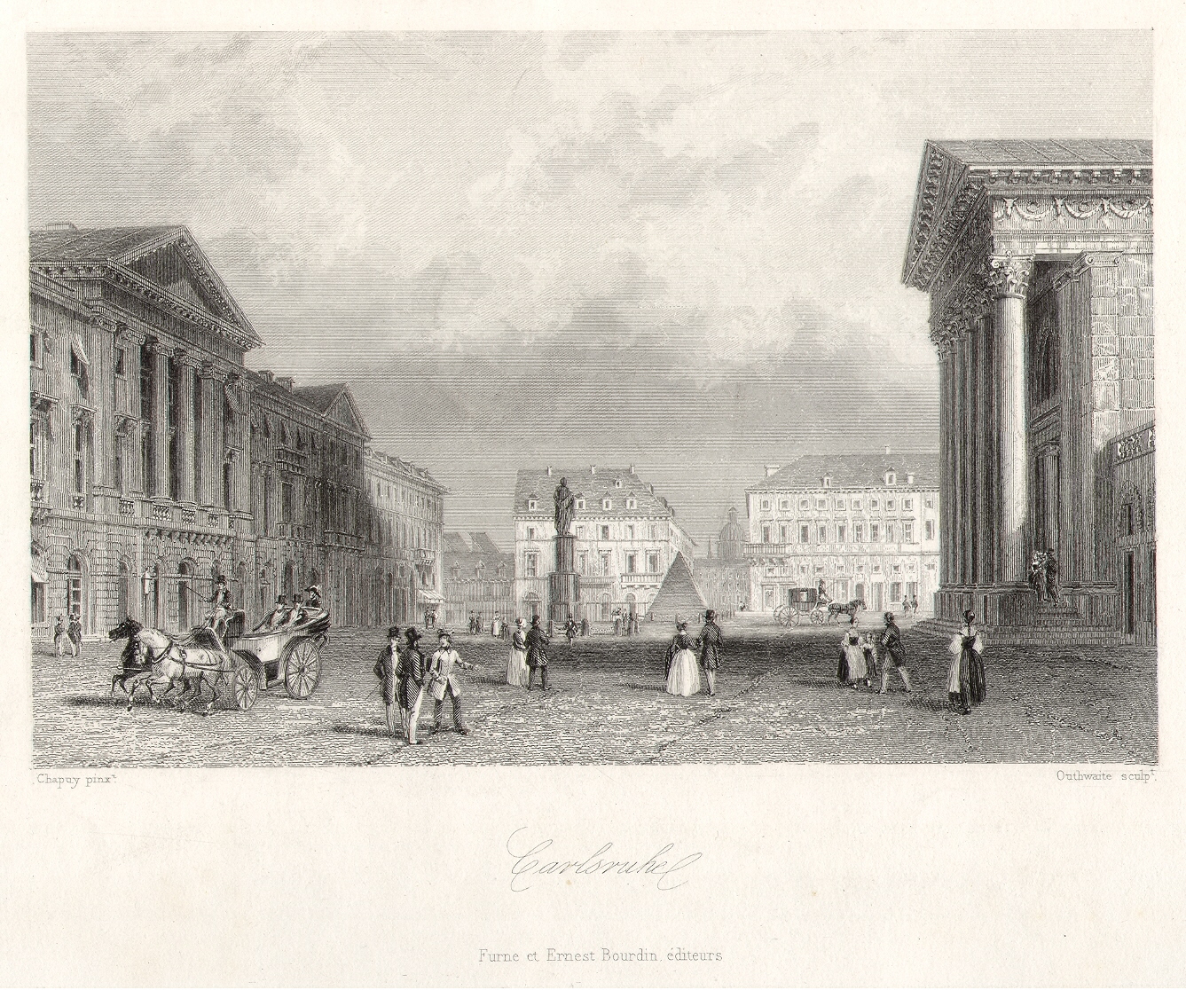 Carlsruhe, Ansicht des Marktplatzes von Süden nach Norden in Stahlstich. Bildunterschrift: Carlsruhe. Chapuy pinx. Outhwaite sculp. (Schefold Nr. 27863) [# ]