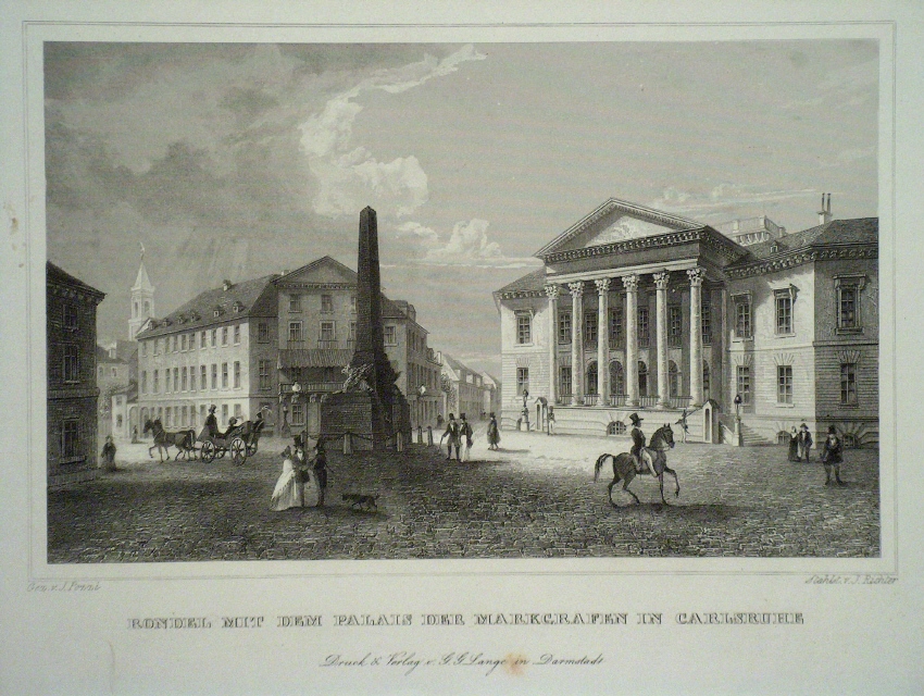 Rondell mit dem Palais der Markgrafen von Baden. Gez.v. J.Pozzi, Stahlstich von J. Richter. Druck und Verlag v. G.G. Lange in Darmstadt.