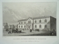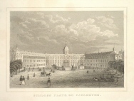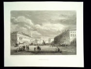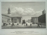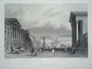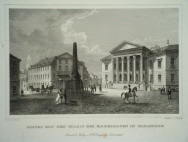 Carlsruhe, Ansicht des Marktplatzes von Süden nach Norden in Stahlstich. Bildunterschrift: Carlsruhe. Chapuy pinx. Outhwaite sculp. (Schefold Nr. 27863)