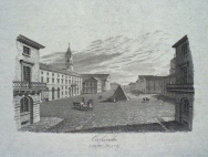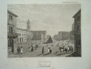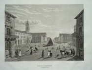 Carlsruhe, Ansicht des Marktplatzes von Norden nach Süden in Stahlstich.