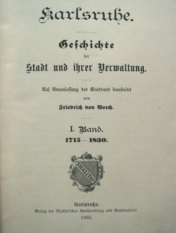 Karlsruhe. Geschichte der Stadt und ihrer Verwaltung. Auf Veranlassung des Stadtrats bearbeitet von Friedrich von Weech. Karlsruhe, Verlag der Macklot´schen Buchhandlung und Buchdruckerei. 1895-