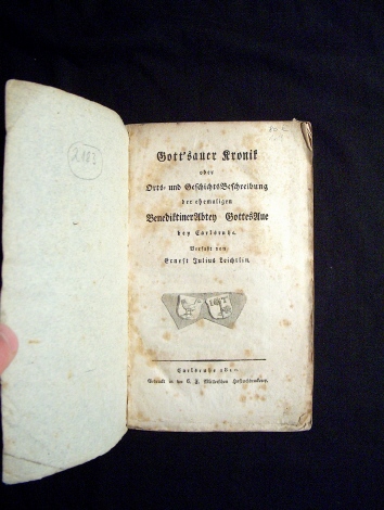 Gott´sauer Kronik oder Orts- und Geschichtsbeschreibung der ehemaligen Benediktiner Abtey Gottesau bey Carlsruhe, verfasst von Ernest Julius Leichtlin. Carlsruhe 1810. Gedruckt in der C.F.Müllerschen Hofbuchhandlung. ...mehr.