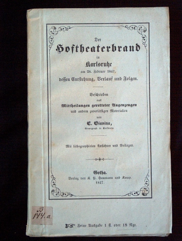 Der Hoftheaterbrand in Karlsruhe am 28. Februar 1847, dessen Entstehung, Verlauf und Folgen. Beschrieben aus Mittheilungen geretteter Augenzeugen und andern zuverlässigen Materialien von F.Giavina, Stenograph in Karlsruhe. Mit lithographierten Ansichten und Beilagen. Gotha. Verlag von K.P.Haumann und Komp. 1847. Druck der F. Macklot´schen Hofbuchdruckerei in Karlsruhe. ...mehr.