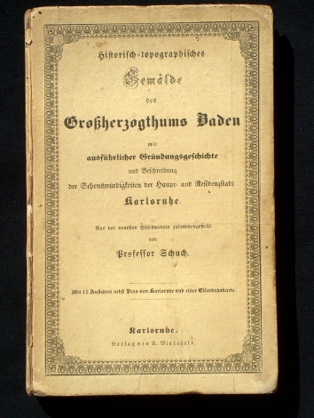 Historisch-topographisches Gemälde des Großherzogtums Baden mit ausführlicher Gründungsgeschichte und Beschreibung der Sehenswürdigkeiten der Haupt- und Residenzstadt Karlsruhe. Aus den neuesten Hülfsmitteln zusammengestellt von Professor Schuch. Mit 17 Ansichten nebst Plan von Karlsruhe und einer Eisenbahnkarte. Karlsruhe, Verlag von A. Bielefeld. ...mehr