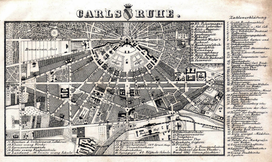 Carlsruhe , Plan wahrscheinlich aus einem Baedekers - Reiseführer. Der 1853 eröffnete Theaterneubau von Heinrich Hübsch am Schloßplatz fehlt noch.