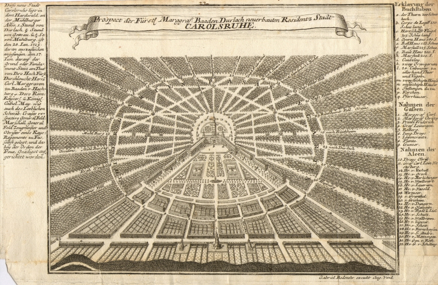 Prospect der Fürstl. Marggraf Baden Durlach neu erbauten Residentz Stadt Carolsruhe. Kupferstich, Bodenehr 1721. Unkoloriert.