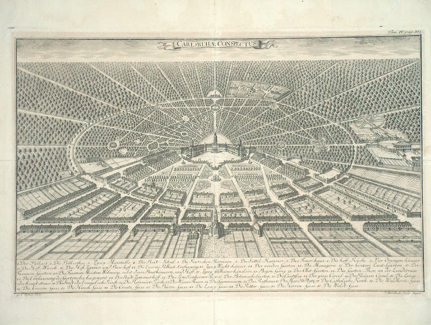 G.N. Fischer delin. F.Striedbeck Sculp. Argent. Kupferstich um 1760. Achsialer Prospekt aus der Vogelschau. Format ca. 43 x 28 cm, unter der Abbildung Beschreibung von 1 bis 46. Oben rechts über der Abbildung: Tom. IV. pag. 369. (Schefold 27292)