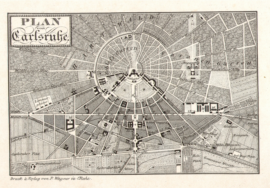 Plan von Carlsruhe. Druck und Verlag von P.Wagner in CRuhe. Dieser Plan stammt aus dem Buch: XXXII Ansichten mit dem Panorama und dem Plan von Carlsruhe nebst einem erklärenden Text.