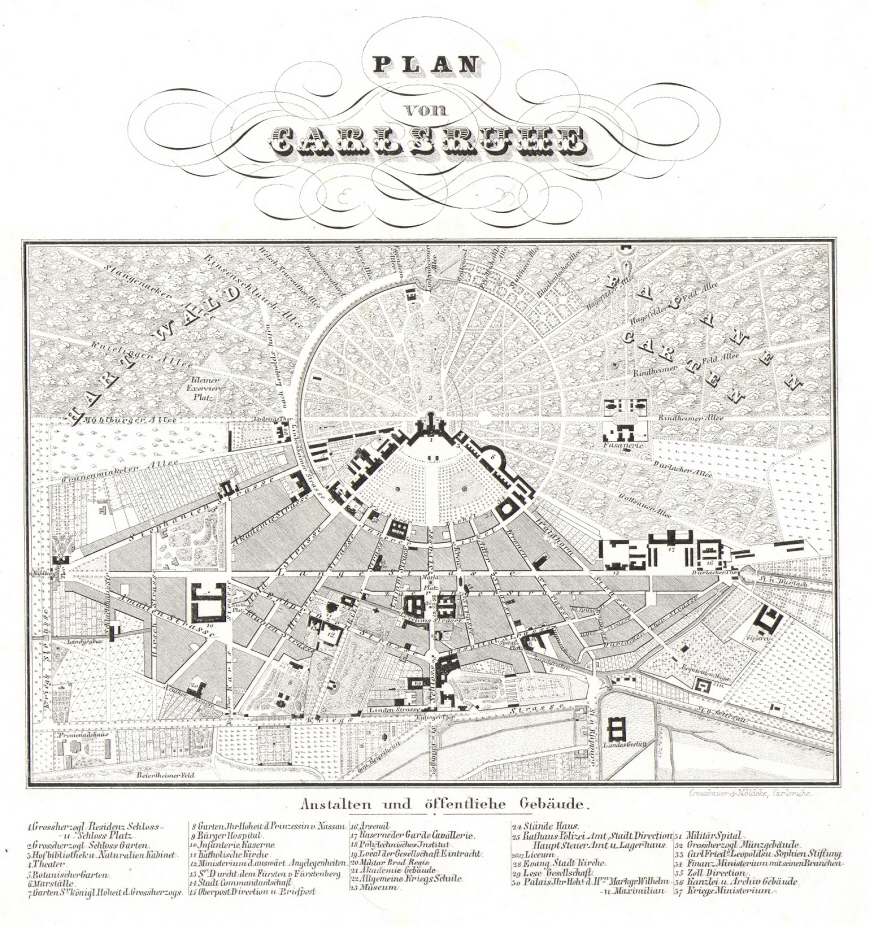 Plan von Carlsruhe. Lithographischer Stadtplan von Karlsruhe um 1840. Creuzbauer und Nöldeke, Carlsruhe. Unter dem Plan : Anstalten und öffentliche Gebäude mit Beschreibung von 1 bis 37.