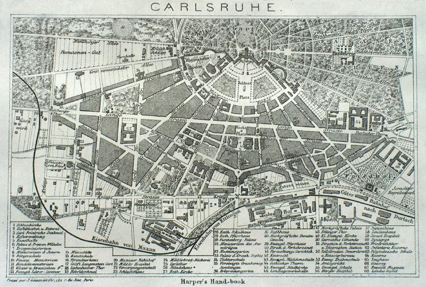 Carlsruhe, Harper´s Hand-Book, um 1882. Stadtplan aus einem amerikanischen Reiseführer von 1882.