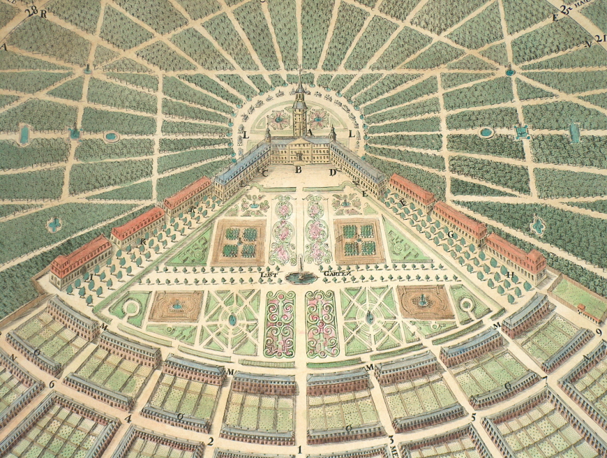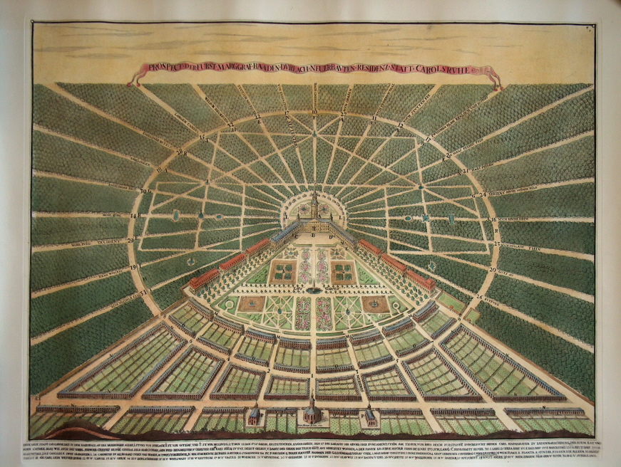 Prospect der Fürst Marggraf Baaden Durlach neuerbauten Residenz Statt Carolsruhe. Heinrich Schwarz, Kupferstich von 1721, Nachdruck von der Originalplatte, koloriert. Format