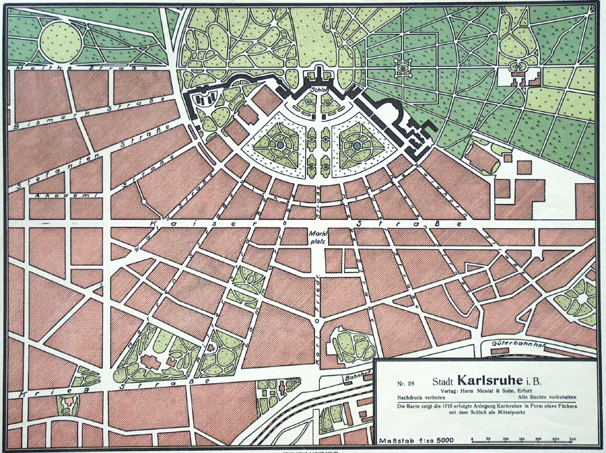 Stadt Karlsruhe i.B., Verlag Herm(ann) Nicolai & Sohn, Erfurt. Um 1927. Maßstab ca. 1 : 5.000. Maße der Abbildung ca. 36 cm x 27 cm. Es handelt sich um einen lithographischen Plan in
