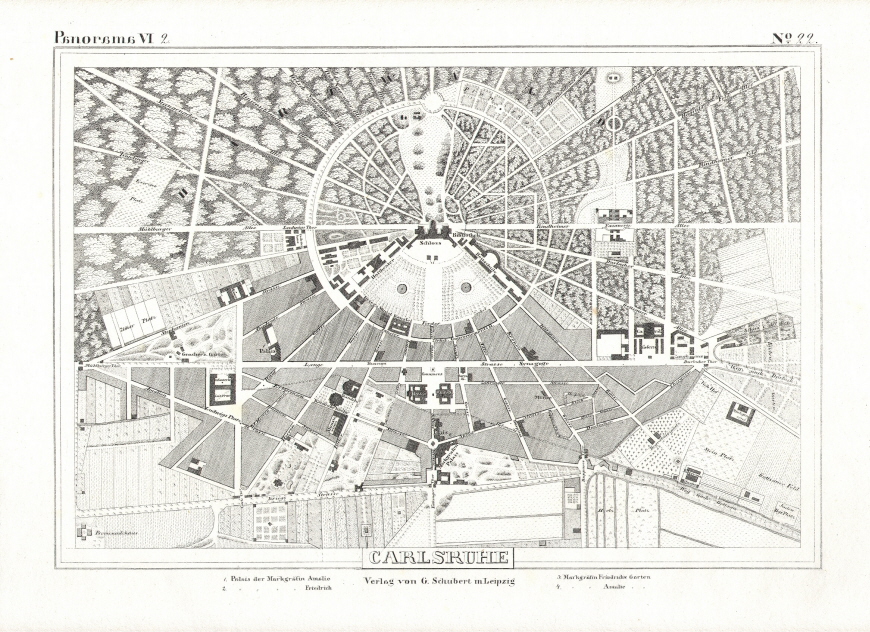 Carlsruhe, Panorama VI 2. No.22, Beschreibung von 1 - 4, Verlag von G. Schubert Leipzig, um 1830 (Schefold 27269).