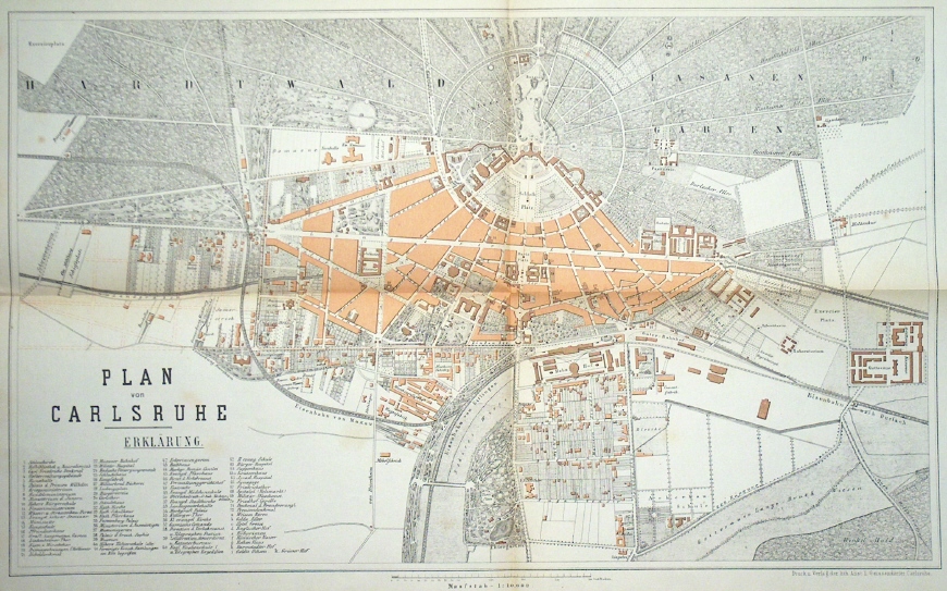 Plan von Carlsruhe, 1872. Maßstab 1:10.000, Format 42 x 25 cm, Beschreibungen von 1 - 72 und a - k. Druck und Verlag der Lithographischen Anstalt L.Geissendörfer Carlsruhe. Aus dem Buch,