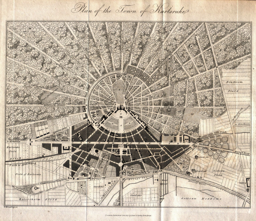 Plan of the Town of Karlsruhe, T. Bradley sc, London, Published Dec. 1827 by Hunt & Clarke, York Street, Beschriftung in englischer Sprache, mehrfach gefaltet.