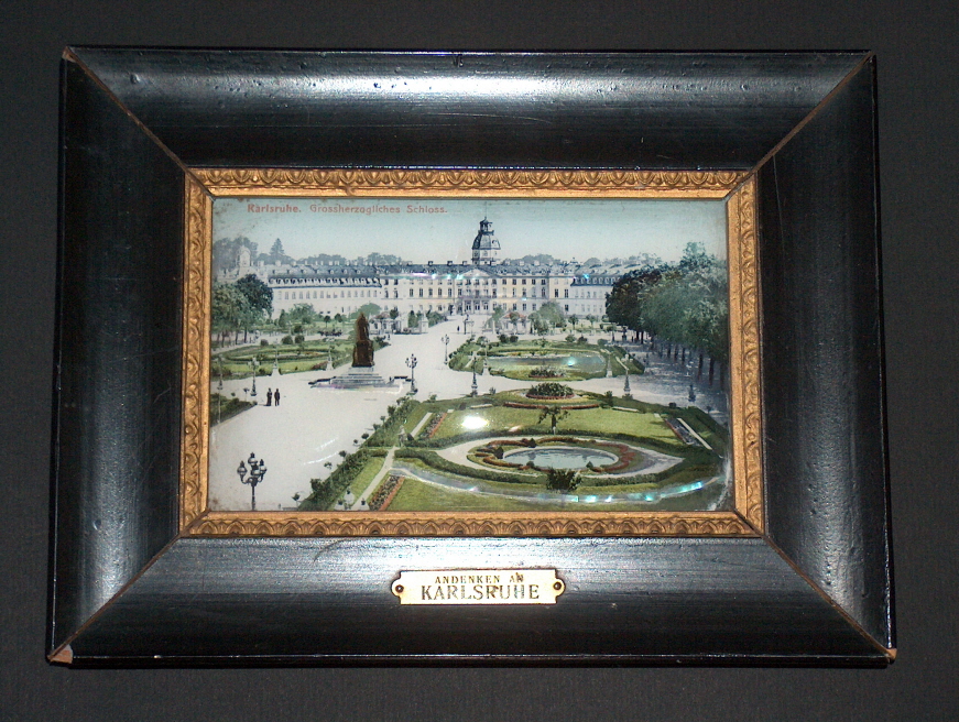 Andenken an Karlsruhe, Souvenirbild, Holzrahmen mit einer kolorierten Fotoansicht des Karlsruher Schlosses hinter Glas, um 1900.
