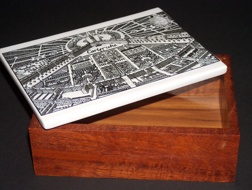 Holzdose mit Ansicht von Karlsruhe auf Porzellandeckel.