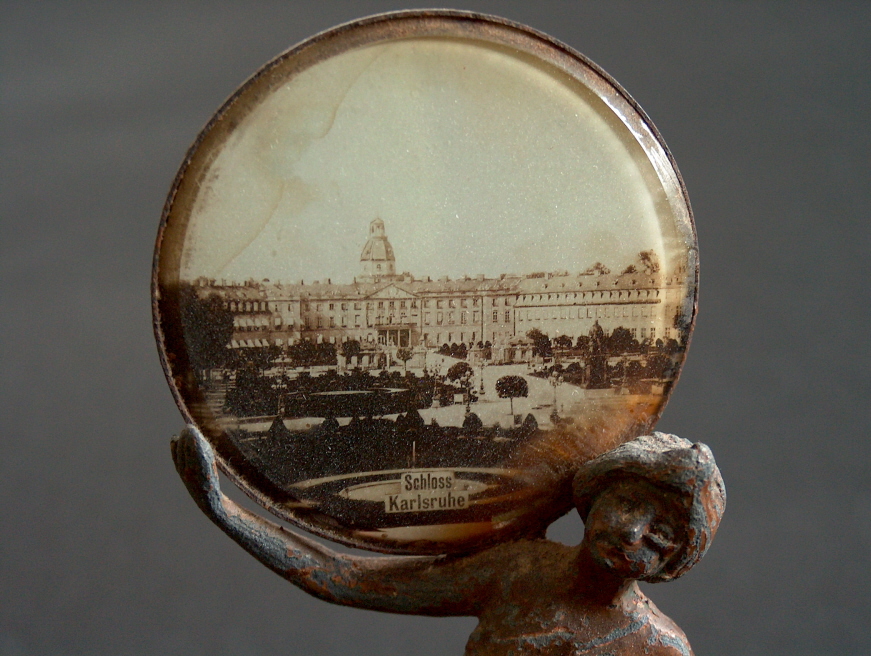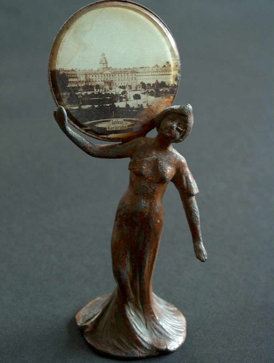 Jugendstilfigur aus Metall, die eine Fotoansicht des Karlsruher Schlosses hinter Glas trägt. Ca. 15 cm hoch, um 1900.