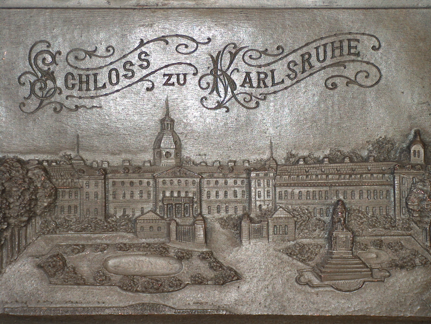 “Schloss zu Karlsruhe” Metallrelief, ca 14 x 11 cm. Vermutlich ursprünglich mit Holzrahmen. Um 1900.