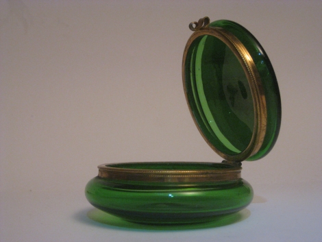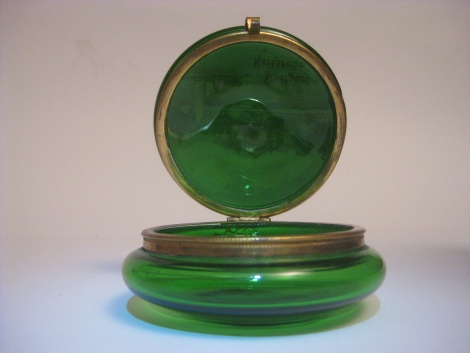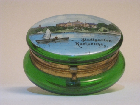 “Stadtgarten Karlsruhe” - Runde Dose aus grünem Glas mit Metallverschluss. Durchmesser ca. 9 cm , Höhe ca. 4 cm. Das Deckelbild zeigt die Südseite der Festhalle mit dem Stadtgartensee und einem Boot. Diese Ansicht