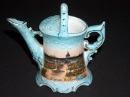 Blaue Porzellankanne mit Ansicht des Schlosses, ca. 10 cm hoch.