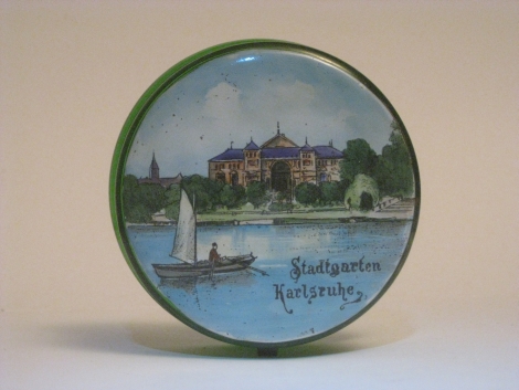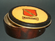 Blechdose mit Wappen Fidelitas und Schriftzug Karlsruhe.