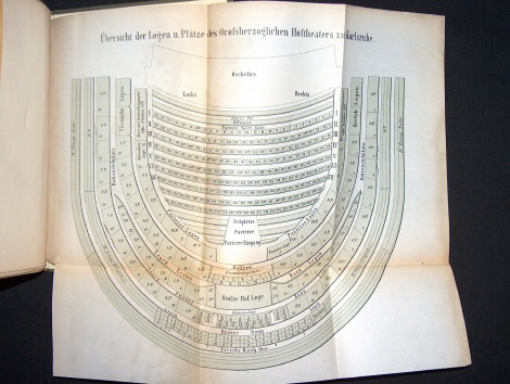 Stadtplan: Maßstab 1:10.000, Erklärungen 1 - 72, Format Blatt ca. 29 x 42 cm. Enthält ferner eine “Übersicht der Logen und Plätze des Großherzoglichen Hoftheaters zu Karlsruhe”
