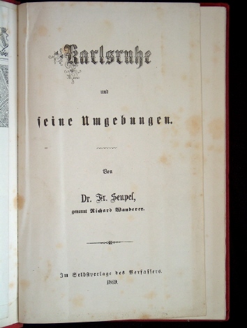 Karlsruhe und seine Umgebungen, Friedrich Seupel, Karlsruhe, G.Braun, 1869. Rotes Ganzleinen mit Goldprägung, 420 Seiten, Format ca. 15 x 20 cm, keine Abbildungen, aber mit einem schönen ausklappbaren lithographischen Stadtplan.