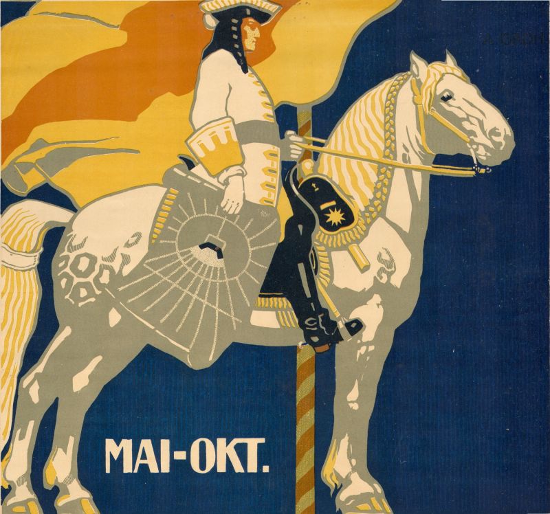 Der Stadtgründer Karl Wilhelm auf einem Pferd mit einem Plan der Stadt in der rechten Hand. Abbildung auf einem Plakat anlässlich der Badischen Jubiläumsausstellung 1915 in Karlsruhe.
